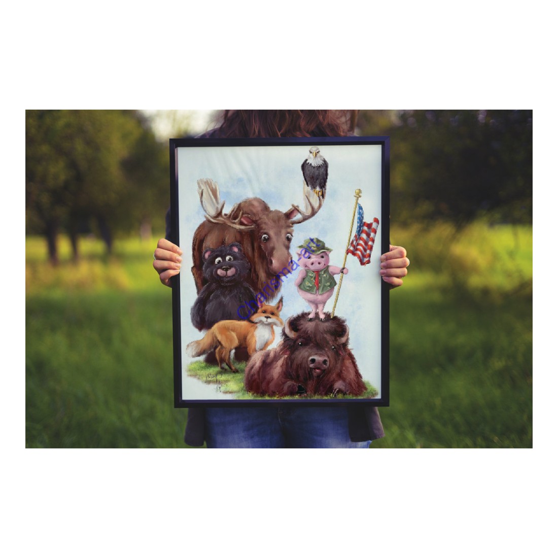 National Pork Wild Animals Print with Fox, Bison, Moose, Bear, Eagle, and Pig